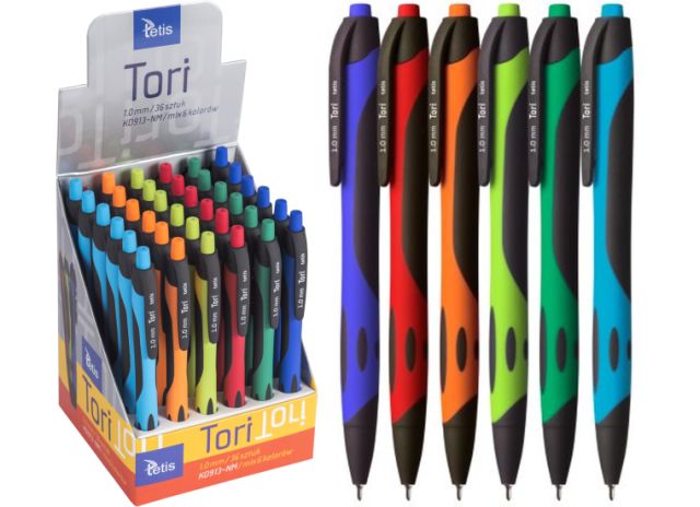Długopis automatyczny TORI wyposażony w końcówkę igłową i miękko piszący wkład olejowy. Grubość linii pisania: 1,0 mm. Mix kolorów obudowy. Wkład niebieski. Opakowanie: display 36 sztuk.