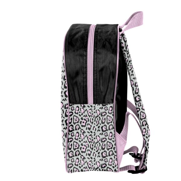 Mały plecak przedszkolny, jedna komora, jedna boczna kieszeń z siatki (mieści małą butelkę, bidon lub termos). Regulowane szelki, wygodny uchwyt do przenoszenia. 28x22x10
