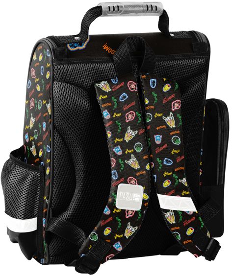 Tornister szkolny. Jedna obszerna komora z wewnętrzynym przedziałem. Na przodzie zapinana kieszeń. Dwie kieszenie po bokach: jedna z siatki, druga zapinana na zamek. Ergonomicznie ukształtowane, sztywne plecy. Wygodnie wyprofilowane szelki. Wymiary: 36x28x15