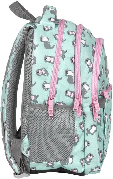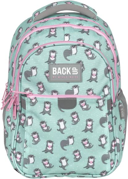 Nr: AX464DF Kod kreskowy: 5901130101078 Nr kat. PLB6P12 Wydry śpiąc na wodzie trzymają się za łapki, aby się nie zgubić. Gdy się już obudzą szaleją na plecaku z nowej kolekcji Backup! Te cudaczne, szare zwierzaki pluskają się na miętowym materiale plecaka, osładzając każdy szkolny poranek i wysyłając trzymane w łapkach serduszka. Różowe suwaki i zamki dodają dziewczęcego uroku. Dzięki rozmiarom dopasowanym do drobnej postury dziecka, to idealny plecak dla pierwszoklasisty. Plecak BackUP posiada: - 3 komory