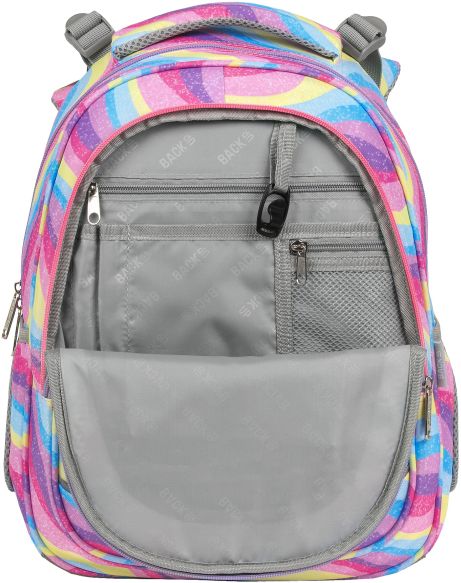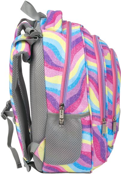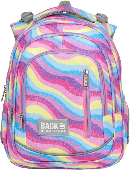 Nr: AX472DF Kod kreskowy: 5901130101146 Nr kat. PLB6R21 Eksplozja kolorów, która przepływa falami barw błekitu, różu, fioletu i żółci. A wszytko to zwieńczone posypką z brokatu! To plecak dla dziewczynki, która nie boi się wyrażać swego indywidualnego, barwnego stylu. Inspirowany stylem Y2k, pełen energii plecak szkolny idealnie uzupełniają dwukolorowe, różowo-fioletowe zamki. Dzięki rozmiarom dopasowanym do drobnej postury dziecka, to idealny plecak dla pierwszoklasisty. Plecak BackUP posiada: - system „grow with me” z regulacją wysokości położenia szelek