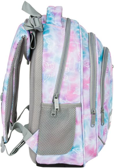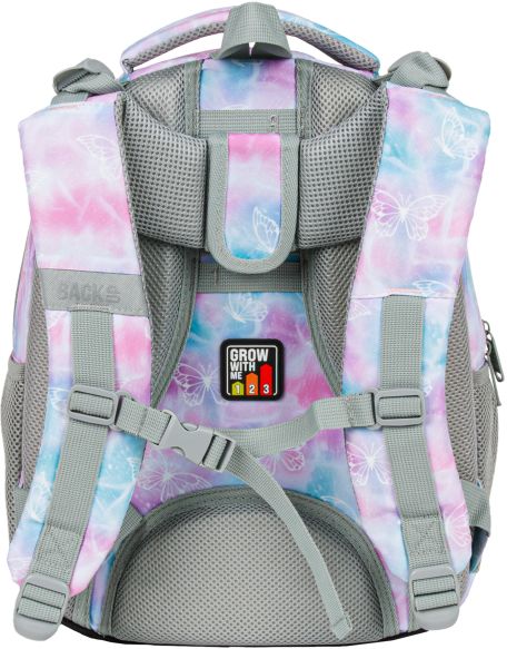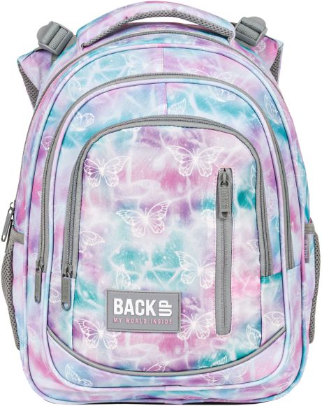Nr: AX471DF Kod kreskowy: 5901130101139 Nr kat. PLB6R10 Motyle na bajkowym, pastelowym tle - to plecak dla dziewczynki, która jest prawdziwą marzycielką. Romantyczne połączenie delikatnych barw różu, fioletu i turkusu przeplata się z pasmami świetlistej bieli. Szare elementy suwaków i zamków dopełniają całości. Wzór w motyle przenosi do magicznego świata, pełnego piękna. Dzięki rozmiarom dopasowanym do drobnej postury dziecka, to idealny plecak dla pierwszoklasisty. Plecak BackUP posiada: - system „grow with me” z regulacją wysokości położenia szelek