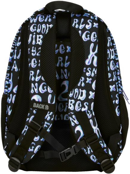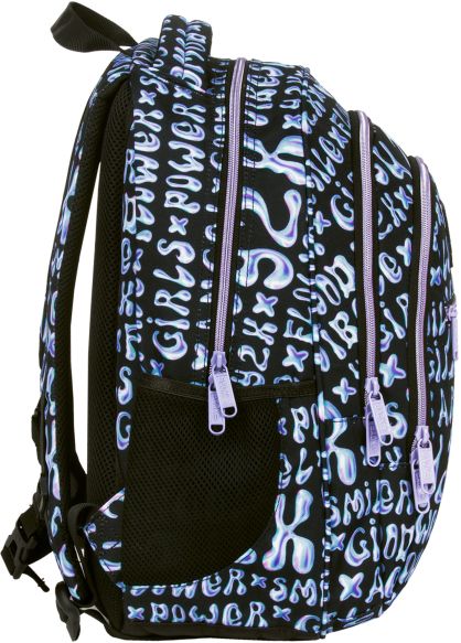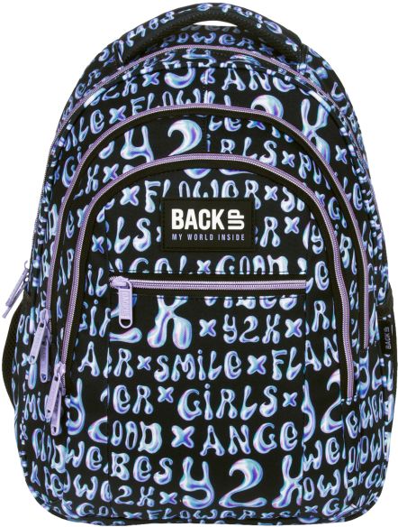 Nr: AX450DF Kod kreskowy: 5901130100897 Nr kat. PLB6O08 Plecak szkolny, który pokocha każda nastolatka. Minimalistyczna, klasyczna czerń materiału ozdobiona metalicznymi, motywującymi napisami z efektem holo, które dodają energii. Niezwykle modna czcionka inspirowana stylem Y2K przyciąga wzrok największych trendsetterów. Całość dopełniona jest suwakami i zamkami w stylowym odcieniu fioletu. To plecak dla dziewczynki, która wyznacza trendy na szkolnym korytarzu. Plecak BackUP posiada: - 3 duże komory