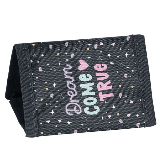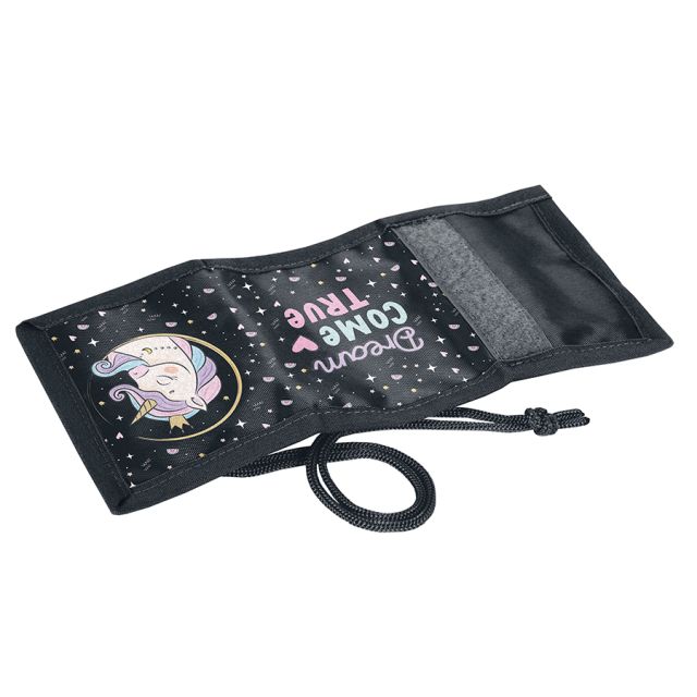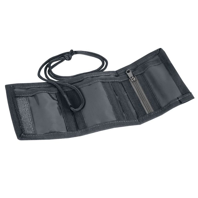 Portfel ze sznurkiem do zawieszania. Jedna przegródka na zamek na monety, jedna przeźroczysta kieszonka np. na zdjęcie, dwie dodatkowe kieszonki, jedna kieszeń przez całą długość rozłożonego na płasko portfela.