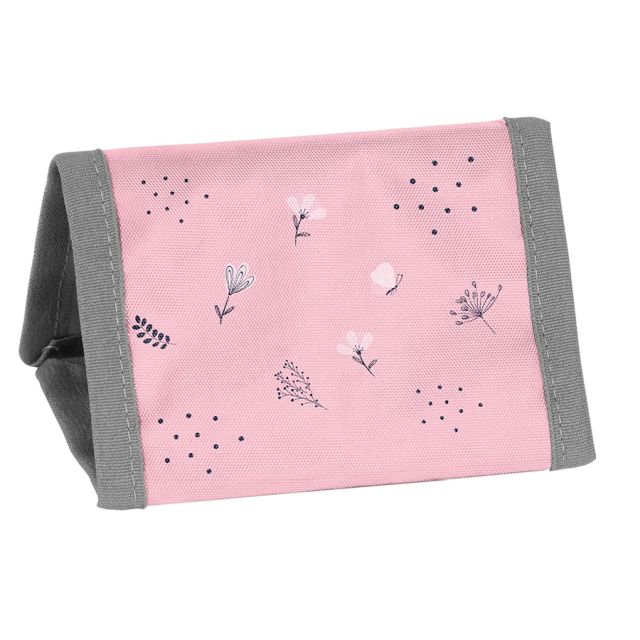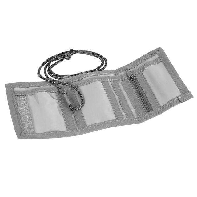 Portfel ze sznurkiem do zawieszania. Jedna przegródka na zamek na monety, jedna przeźroczysta kieszonka np. na zdjęcie, dwie dodatkowe kieszonki, jedna kieszeń przez całą długość rozłożonego na płasko portfela.