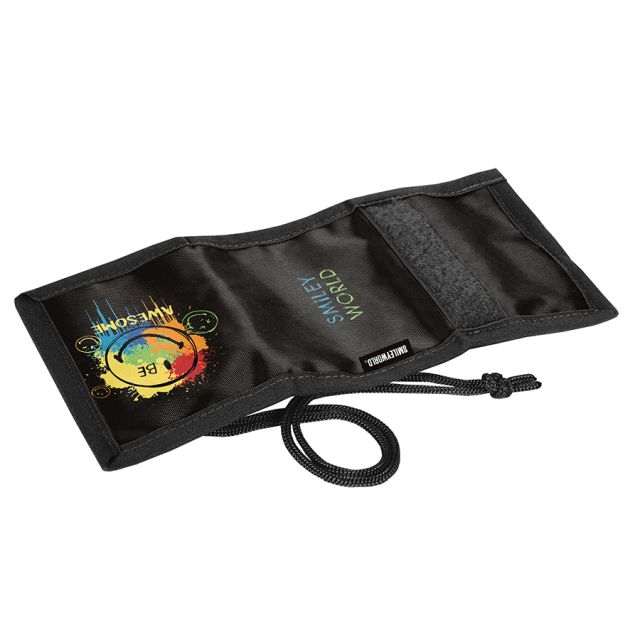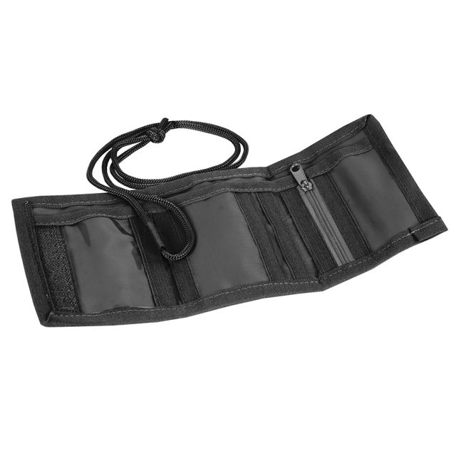 Portfel ze sznurkiem do zawieszania. Jedna przegródka na zamek na monety, jedna przeźroczysta kieszonka np. na zdjęcie, dwie dodatkowe kieszonki, jedna kieszeń przez całą długość rozłożonego na płasko portfela.