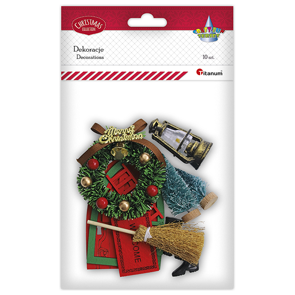 Titanum » Boże Narodzenie » Nowości Boże Narodzenie 2025 » Drewniana dekoracja wejście dla Elfów 15 elementów drzwi 66x100mm, miotła 100mm, drabina 20x60mm, okno 31x46mm, wycieraczka 35x54mm, wianek 75mm, choi