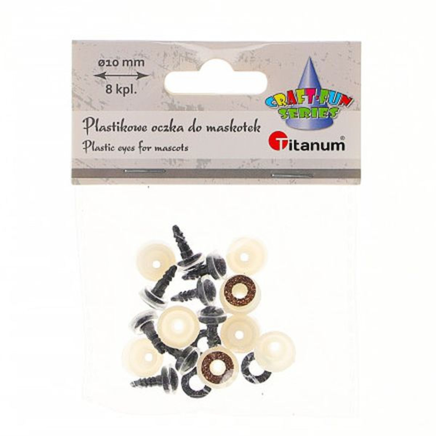 Titanum » Artykuły dekoracyjne całoroczne » Oczka Dekoracyjne » Oczy do maskotek plastikowe O10mm z mocowaniem za pomocą zapinki brokatowe brązowe 8kpl.