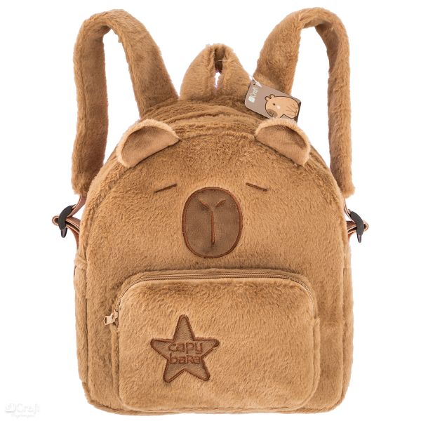 Plecak pluszowy z motywem kapibary o wymiarach 28 x 25 x 11 cm. Miękki i przyjemny w dotyku, idealny dla dzieci i miłośników uroczych akcesoriów. Posiada regulowane szelki, jedną dużą komorę oraz jedną mniejszą kieszeń na drobiazgi.