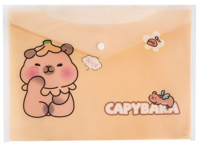 Praktyczna teczka w formacie A4 z wygodnym zatrzaskiem, idealna do przechowywania dokumentów. Ozdobiona uroczym motywem kapibary w beżowym kolorze, doskonale sprawdzi się w szkole, biurze lub domu.