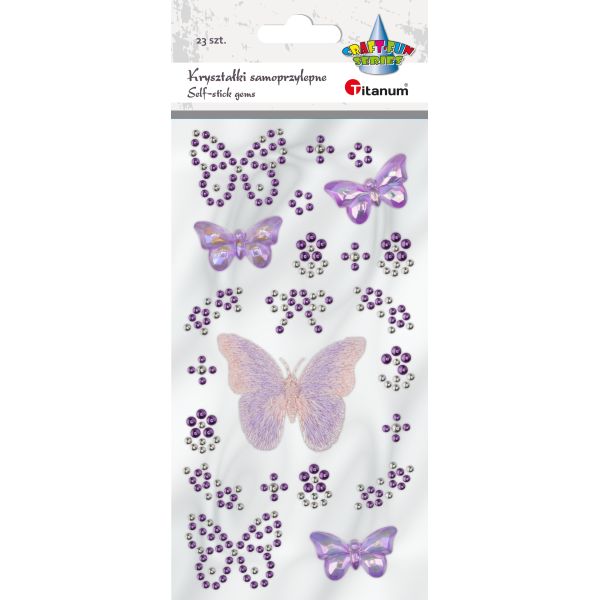 Titanum » Artykuły dekoracyjne całoroczne » Kryształki, Perełki » Kryształki samoprzylepne motyle mix (w tym z kryształków 36x28mm, akrylowe 32x18mm, z muliny na tkaninie 54x45mm) fioletowe 23szt.