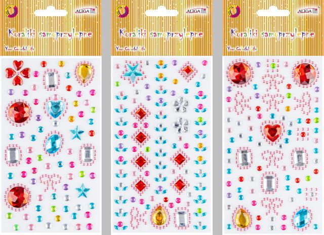 Dżety, kryształki samoprzylepne. Mix wzorów i kolorów. Wymiary blistra: 9 cm x 16 cm