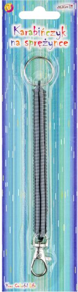 Karabińczyk (3,5 cm) na sprężycne z kółkiem do breloczka (2,5 cm). Długość całkowita: 17,5 cm