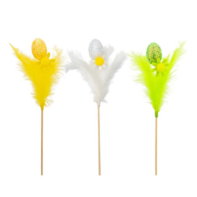 Pisanki z brokatem z piórkami na piku rozmiar: 3, 5 x 3 x 36 cm w opakowaniu: 3 wzory kolor: bia³y, zielony, ¿ó³ty