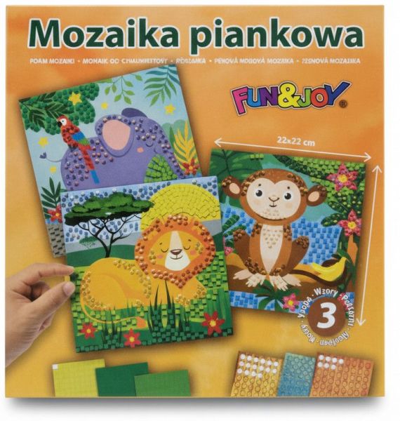 MOZAIKI PIANKOWE W KARTONIKU 3 WZORY: SŁOŃ Z PAPUGĄ, LEW, MAŁPA, WYMIARY: 22x22 cm FUNxJOY