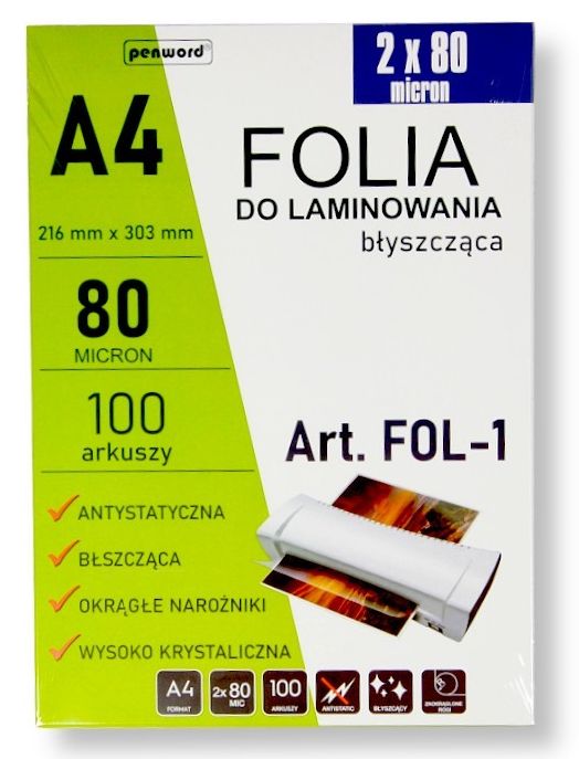 FOLIA LAMINACYJNA FOL-1 2x80mic A4/100 216mmx303mm BŁYSZCZĄCAdokument nie przyczepia się do folii, nie elektryzuje się, łatwo przesuwa folia do laminacji stanowi ochronę dokumentów przed wilgocią, kurzem i zabrudzeniem folia zabezpiecza też przed ewentualną interwencją w jego treść laminowanie zdjęć... |