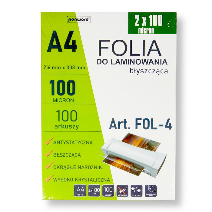 FOLIA LAMINACYJNA FOL-4 2x100mic A4/100 216mmx303mm BŁYSZCZĄCAFolia do laminowania A4: