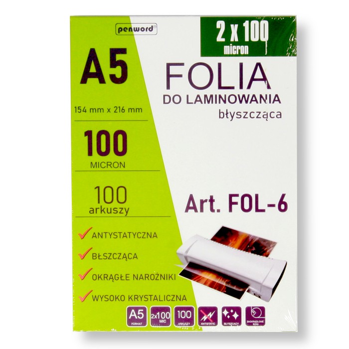 FOLIA LAMINACYJNA FOL-6 2x100mic A5/100 154mmx216mm BŁYSZCZĄCAFolia do laminowania A5: