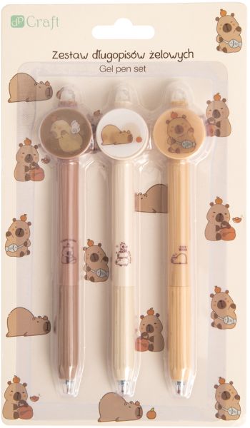 ZESTAW DŁUGOPISÓW ŻELOWYCH ZMAZYWALNYCH - KAPIBARA, 3 SZT - NIEBIESKIE [opakowanie=6szt]Zestaw trzech uroczych zmazywalnych długopisów żelowych z motywem kapibar. Posiadają wygodny uchwyt i szybkoschnący tusz w kolorze niebieskim. Zapewniają płynne pisanie, idealne do szkoły, biura, dzienników czy notatek w plenerze. Zmaż, popraw, pisz... |