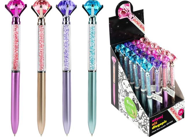 Długopis z diamencikiem GR-F424 (sz)– tusz wodoodporny na bazie oleju – zakończony imitacją diamentu – w korpusie kolorowe kamyczki w kolorze obudowy – długość pisania: 300 m – grubość linii 0,7 mm |