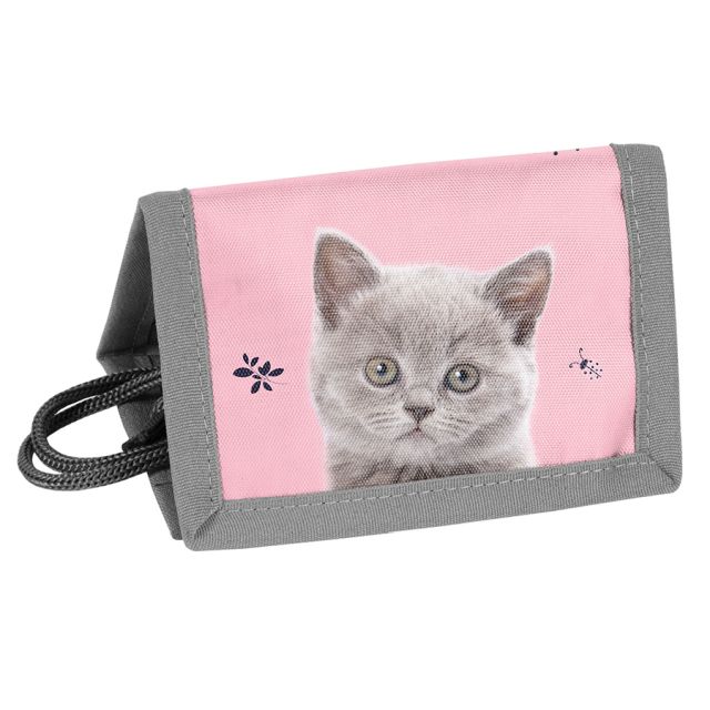 Portfel PASO KOT PP25CO-002 12x8, 5x1 Portfel ze sznurkiem do zawieszania. Jedna przegródka na zamek na monety, jedna przeźroczysta kieszonka np. na zdjęcie, dwie dodatkowe kieszonki, jedna kieszeń przez całą długość rozłożonego na płasko portfela. Wymiary: 12x8,5x1 |