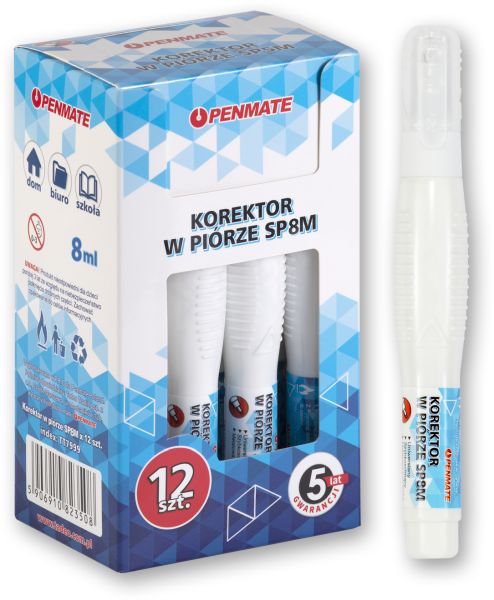 PENMATE KOREKTOR W PIÓRZE 8 ML SP8M W OPAKOWANIU 12 SZT. [opakowanie=12szt]PENMATE Korektor w Piórze SP8M to precyzyjny, szybkoschnący korektor z cienką, metalową końcówką, zapewniający dokładne i estetyczne poprawki. Dzięki gęstemu, dobrze kryjącemu płynowi, idealnie maskuje błędy na wszystkich rodzajach papieru, fotokopiach... |