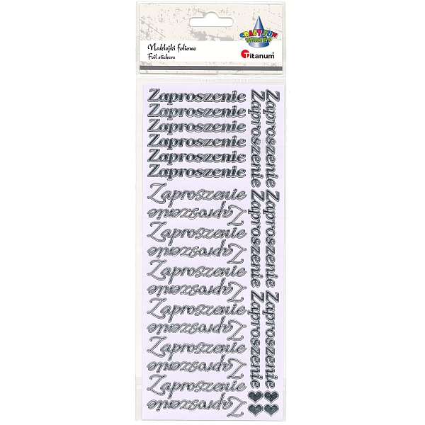 Naklejki foliowe ?Zaproszenie? 3 wzory czcionki, 4 serduszka srebrne 28szt. plansza 100x240mm |