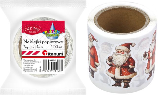 Naklejki papierowe na taśmie mix rozmiarów 8 wzorów Boże Narodzenie Mikołaje 250szt. szerokość taśmy 57mm🎅 Naklejki papierowe Boże Narodzenie – Mikołaje, 250szt. na taśmie