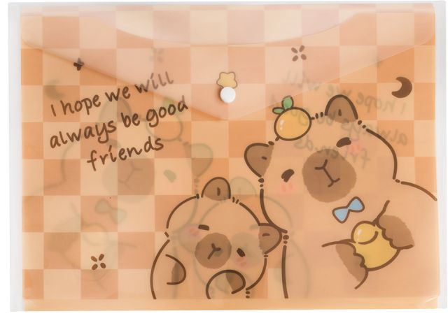 TECZKA KOPERTOWA A4 NA ZASTRZASK KAPIBARA - KRATKA [opakowanie=3szt]Praktyczna teczka w formacie A4 z wygodnym zatrzaskiem, idealna do przechowywania dokumentów. Ozdobiona uroczym motywem kapibary w beżowym kolorze, doskonale sprawdzi się w szkole, biurze lub domu. |