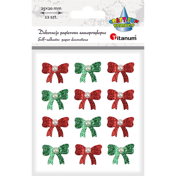 Dekoracje samoprzylepne papierowe 3D kokardki 25x20mm z perełką ciemnoczerwone, ciemnozielone 12szt. |