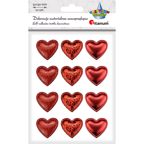 Dekoracje samoprzylepne materiałowe serca PU 32x30mm 3 wzory: drobny brokat, duży brokat, gładkie czerwone 12szt. |