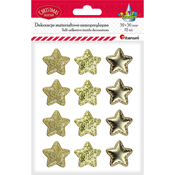 Dekoracje samoprzylepne materiałowe gwiazdki PU 32x30mm 3 wzory: drobny brokat, duży brokat, gładkie złote 12szt. |
