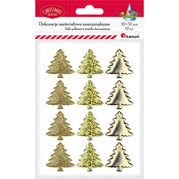 Dekoracje samoprzylepne materiałowe choinki PU 32x32mm 3 wzory: drobny brokat, duży brokat, gładkie złote 12szt. |