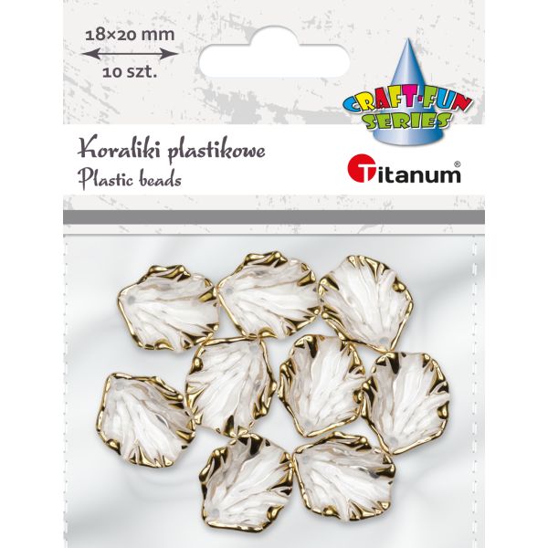 Koraliki plastikowe muszelki przezroczyste ze złotym wykończeniem 18x20mm (grubość 5mm) dziurka O1mm 10szt. |