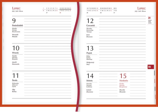 format: B6 rodzaj papieru: offset 70g/m2 biały układ kalendarium: 1 tydzień - 2 strony ilość stron: 144 druk: 2 kolory Oprawa: okładka barwa foliowana, jedna tasiemka.