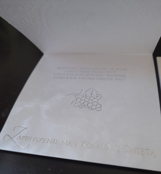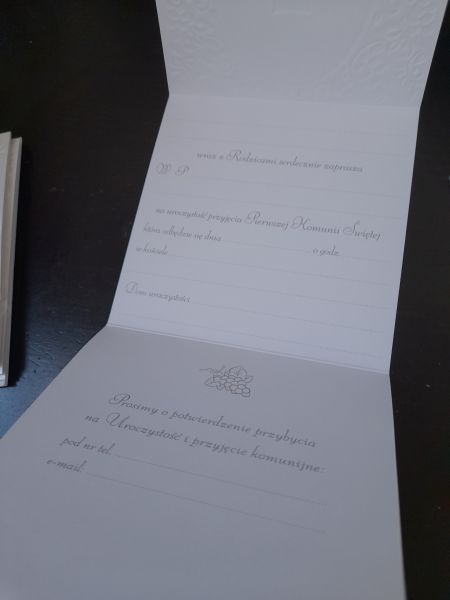 Eleganckie rozkładane zaproszenia komunijne ze srebrnymi żłobieniami. Do każdego zaproszenia dołączona koperta.