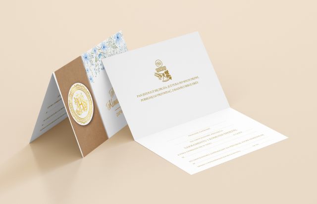 Zaproszenie komunijne z uszlachetnieniem: - druk na matowym papierze,