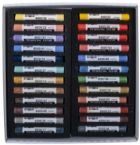 - Pastele suche z serii Toison D'or 8500 - Zestaw zawiera 48 kolorów w kartonowym pudełku - Każdy pastel posiada numeryczne oznaczenie koloru co ułatwia identyfikację - Odznaczają się bardzo szeroką paletą trwałych kolorów i jednolitą strukturą w masie pasteli - Są bardzo kruche i delikatne, dzięki czemu dobrze się rozcierają - Pastele bardzo dobrze przylegają do podłoża - Prace po zakończeniu należy zabezpieczyć przez pokrycie fiksatywą