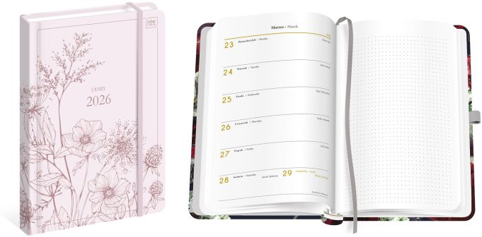 Format B5. Liczba stron: 192. Zaokrąglone rogi. Matowa okładka z efektownymi, błyszczącymi detalami. W środku kolorowa wyklejka. Twarda oprawa skutecznie chroni zawartość przed zniszczeniem. Elastyczna gumka chroni luźne notatki przed wypadnięciem. Kalendarium w układzie 1 tydzień na dwóch stronach. Miejsce na notatki pod każdym dniem. Wyposażony w praktyczną tasiemkę do zaznaczania strony i pętelkę na długopis. W środku także: adresówka, praktyczne kalendarium oraz miejsce na dodatkowe notatki.