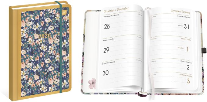 Format B6. Liczba stron: 192. Zaokrąglone rogi. Okładka z modnym metalicznym efektem. W środku kolorowa wyklejka. Twarda oprawa skutecznie chroni zawartość przed zniszczeniem. Elastyczna gumka chroni luźne notatki przed wypadnięciem. Kalendarium w układzie 1 tydzień na dwóch stronach. Miejsce na notatki pod każdym dniem. Wyposażony w praktyczną tasiemkę do zaznaczania strony. W środku także: adresówka, praktyczne kalendarium oraz miejsce na dodatkowe notatki.