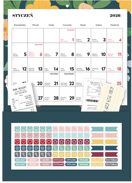 Zawiera kolorowe naklejki do oznaczania ważnych dat. Dwa wzory do wyboru.