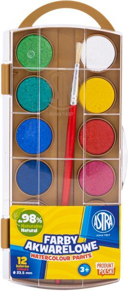 Farby akwarelowe Astra to wysokiej jakości farby wodorozcieńczalne gwarantujące żywe i intensywne kolory. Dzięki wysokiej jakości drobno roztartych pigmentów farby doskonale rozprowadzają się na papierze. Pozwalają również łączyć się z farbami temperowymi, plakatowymi i kredkami woskowymi Astra. Po wyschnięciu matowieją i są odporne na promienie słoneczne. Farby znajdują się na paletce ułatwiającej malowanie.
