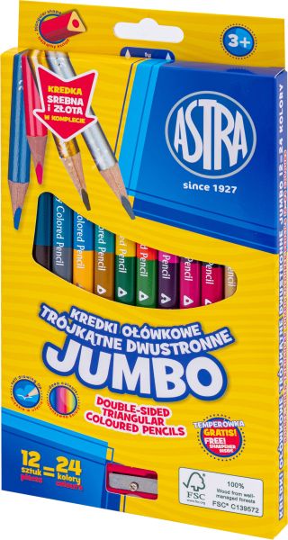 Kredki, Kreda, Pastele » Kredki Ołówkowe Komplety » Kredki Dwustronne » Kredki ołówkowe dwustronne jumbo ASTRA - 12=24 kolory z temperówką, złota i srebrna kredka w komplecie [opakowanie=12szt]