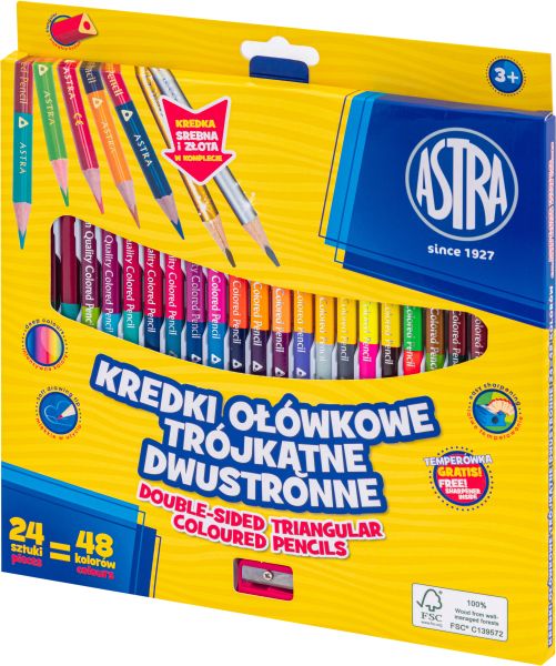 Kredki ołówkowe trójkątne dwustronne ASTRA - 24=48 kolorów z temperówką - złota i srebrna kredka w komplecie [opakowanie=6szt]