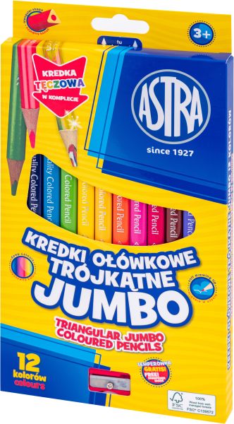 Kredki, Kreda, Pastele » Kredki Ołówkowe Komplety » Kredki Ołówkowe grube » Kredki ołówkowe trójkątne jumbo ASTRA - 12 kolorów z temperówką, tęczowa kredka w komplecie [opakowanie=12szt]