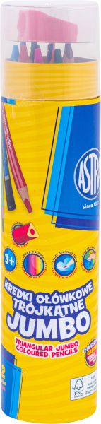 Kredki, Kreda, Pastele » Kredki Ołówkowe Komplety » Kredki Ołówkowe grube » Kredki ołówkowe trójkątne jumbo ASTRA w tubie - 12 kolorów + temperówka [opakowanie=12szt]
