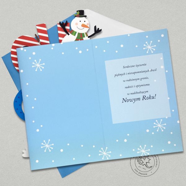 To propozycja pe³na energii i humoru – doskona³a dla dzieci, m³odzie¿y i wszystkich, którzy lubi± nowoczesne, pozytywne ¶wi±teczne motywy. Wewn±trz znajduje siê miejsce na ¿yczenia lub gotowy tekst, a ca³o¶æ uzupe³nia kolorowa koperta w dopasowanej tonacji.