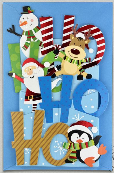 Rozwesel ¶wi±teczne dni kolorow± kartk± 3D od Pan Dragon! Weso³y Miko³aj, renifer, ba³wanek i pingwin tworz± radosny, zimowy korowód wokó³ du¿ych, trójwymiarowych liter „Ho Ho Ho”. Kartka po roz³o¿eniu zachwyca efektem przestrzennym, dziêki czemu idealnie nadaje siê równie¿ jako ¶wi±teczna ozdoba.