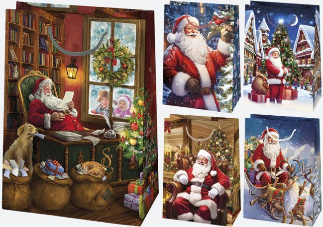 Torebki prezentowe z kolekcji Gwiazdka T5_GW_83 marki POL-MAK to kwintesencja bożonarodzeniowego klimatu i ciepła. Każdy wzór opowiada własną historię – Mikołaj przy kominku, z listą prezentów, w saniach lub pośród zimowej scenerii. Wykonane z wysokogatunkowego papieru kredowego o gramaturze 170 g/m², zachwycają intensywnymi kolorami, precyzyjnym nadrukiem i nastrojową grafiką. Idealne do pakowania dużych prezentów świątecznych – praktyczne i wyjątkowo efektowne.