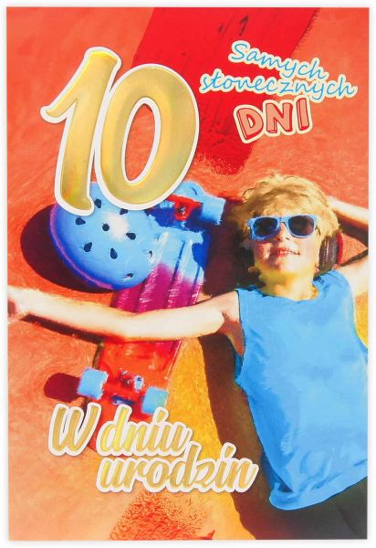 Kolorowa, pe³na wakacyjnej energii kartka od producenta Kartki z Kotkiem, idealna na 10 urodziny ch³opca! Na ok³adce weso³y ch³opiec w okularach przeciws³onecznych i z deskorolk± – gotowy na kolejne przygody! Du¿a, z³ocona cyfra 10 oraz napis „Samych s³onecznych dni” wprowadzaj± radosny, letni klimat, który spodoba siê ka¿demu solenizantowi.